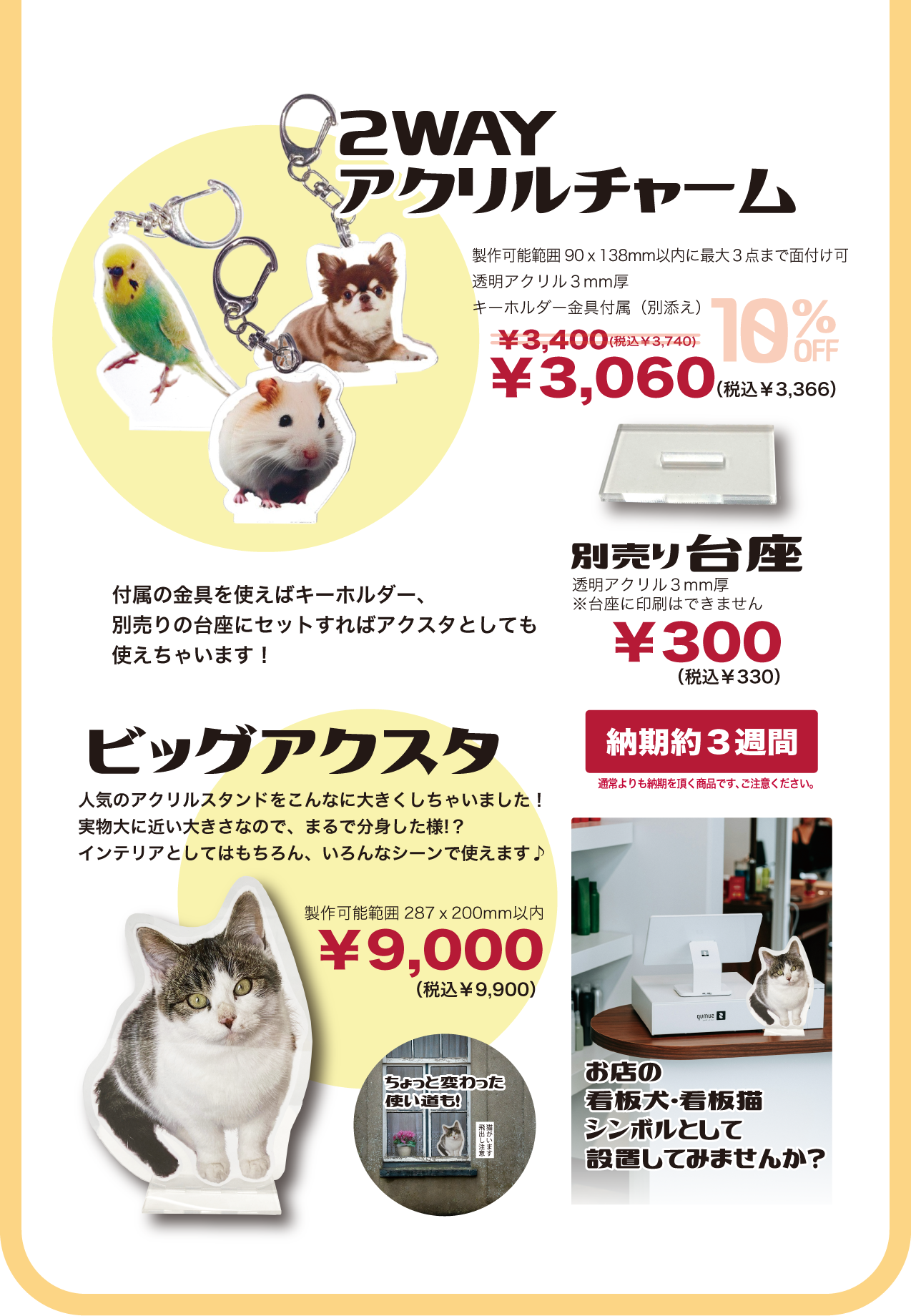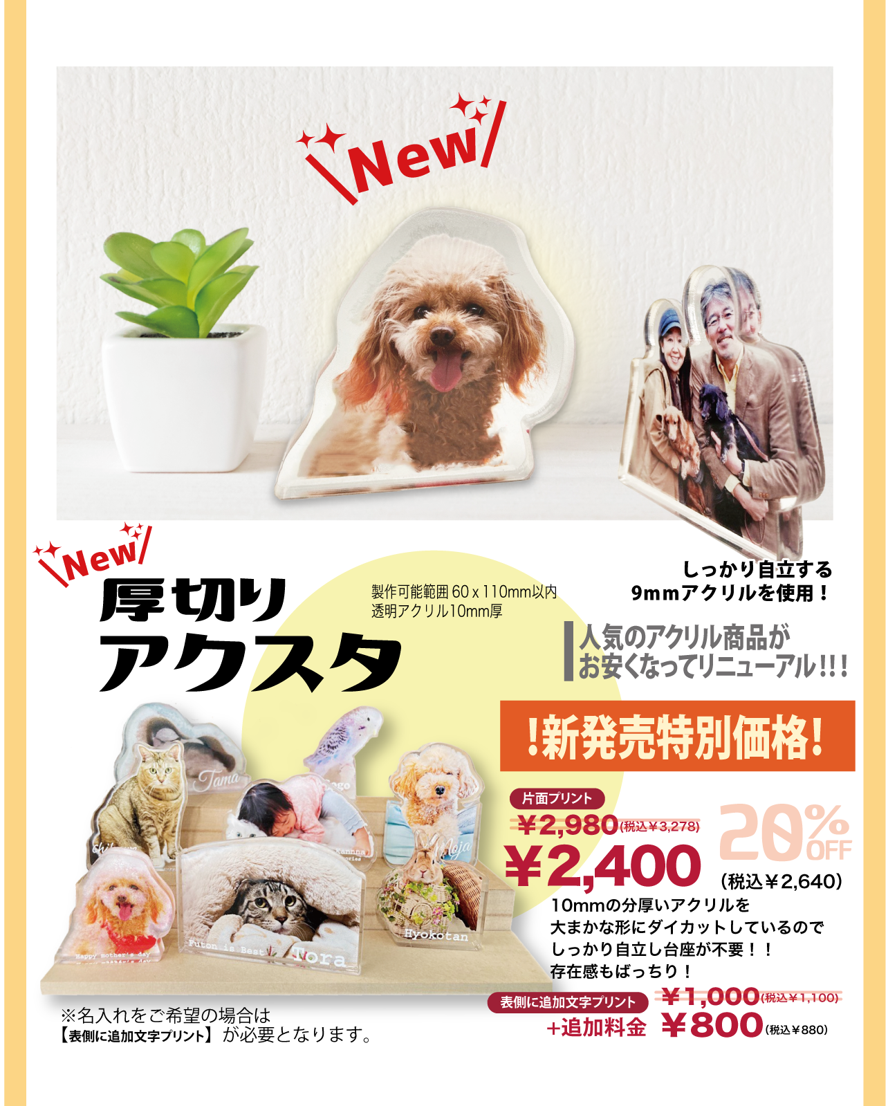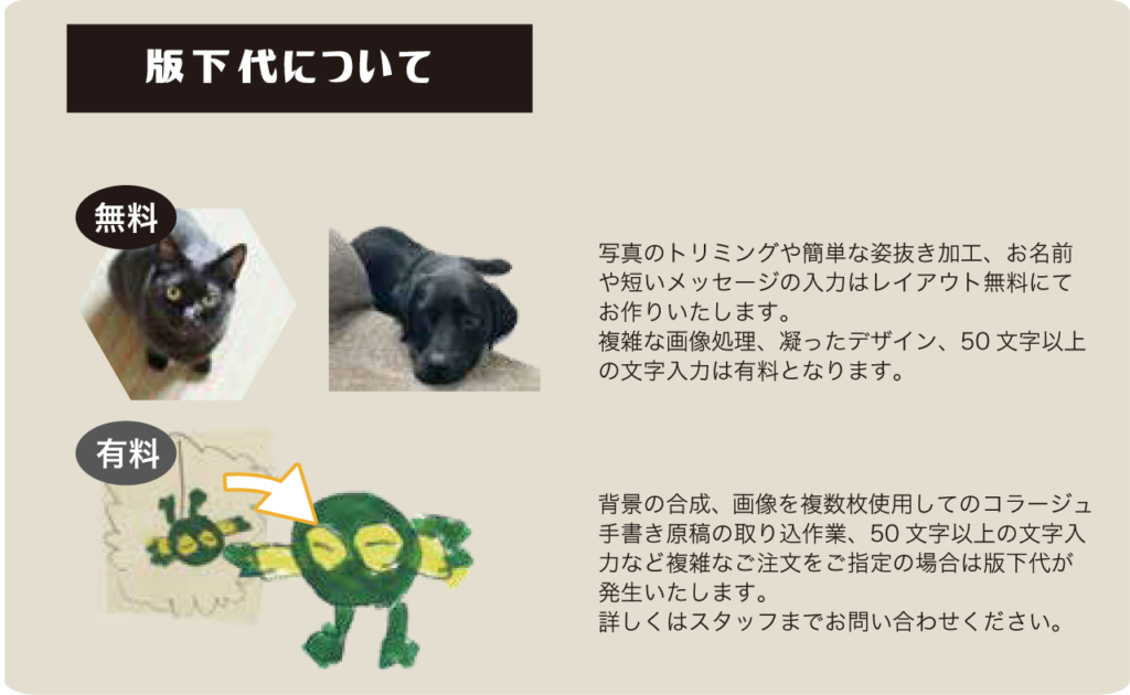 ペット以外の写真でも可能です。誕生日や還暦のお祝い、イベントなどのノベルティー作成も承ります。