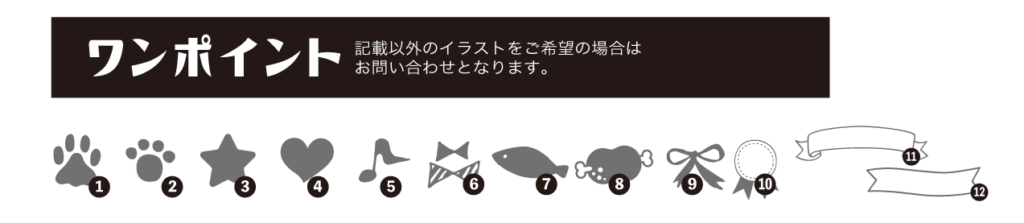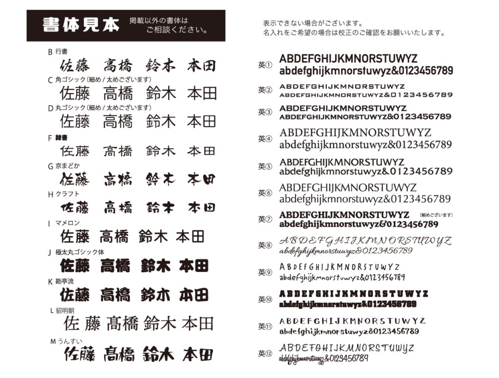 下記の書体から選んでお好きな文字やワンポイントを無料で追加する事ができます。
